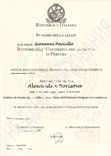 Магистр I степени по методике преподавания итальянского языка в качестве второго или иностранного языка (Университет Перуджи, 2013).